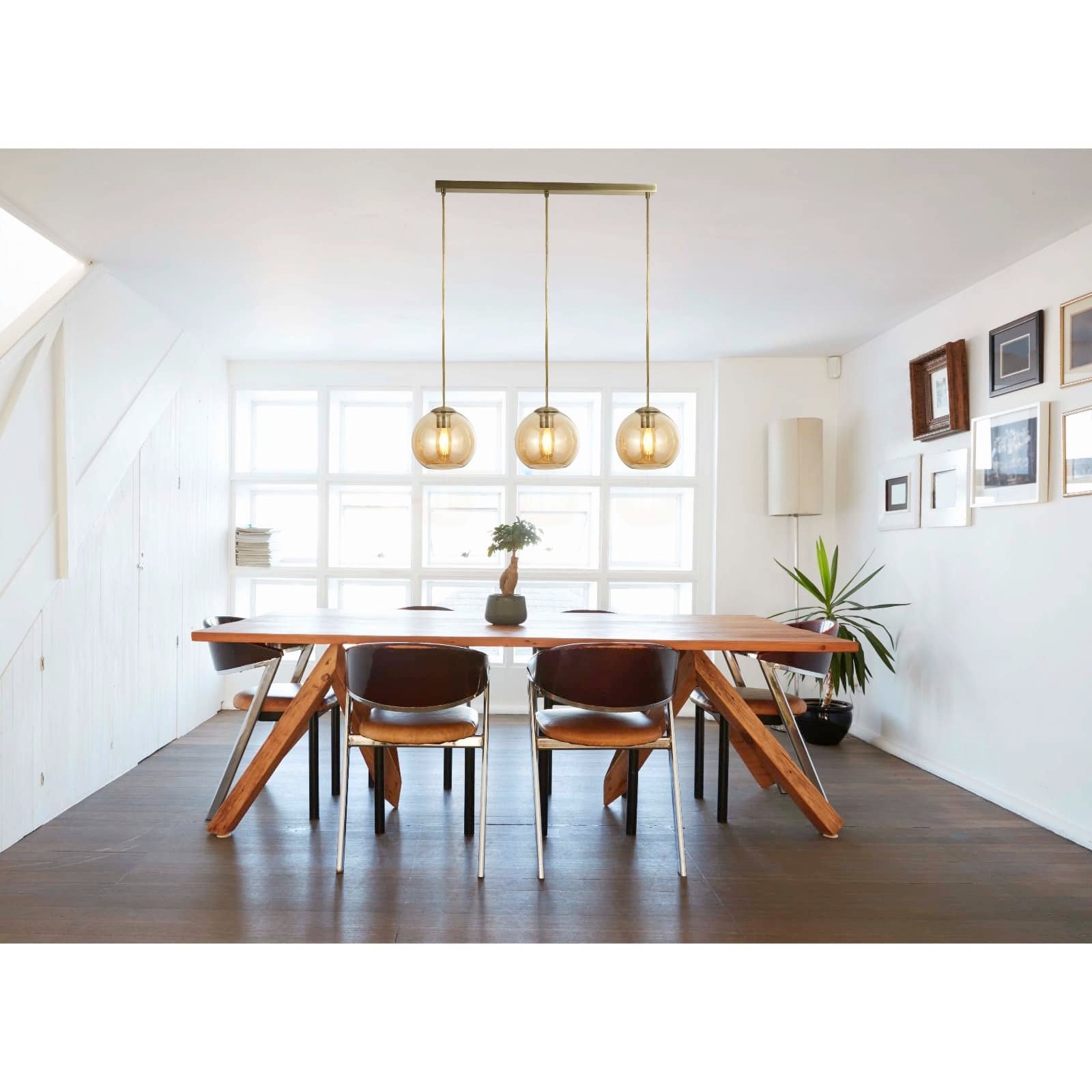 Revamp your living space with our 3 light bar pendant in an antique brass finish and amber glass shades. The glass ball shades make this a distinctive product to hang in your kitchen area whether its above a kitchen island or a dining room table.
