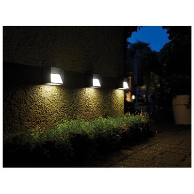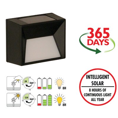 Illuminate your outdoor living space even in remote areas by placing these stylish wall lights in a sunny spot. This solar light is made from durable plastic and can also be used to provide light sufficient to illuminate walkways and driveways etc. The light has an on/off switch and an integral solar panel. All the lamps in the Intelligent LED Solar Series – are equipped with a self-thinking system, which distributes the stored energy evenly over the number of hours the light is in use. The battery charges up by sunlight that the solar panel captures during daylight hours. The light automatically switches on at dusk and then the intelligent Electronics inside the light detects and calculates the battery capacity and always distributes this energy capacity evenly over an 8-hour period. This means that when the battery has less charge, the light will not be as bright, as it will adapt to the power reserve in the battery. The big advantage of this feature is it guarantees 8 hours of light every night, 365 days a year* * Guaranteed, unless the battery will not charge sufficiently due to overcast skies for more than 3 days.